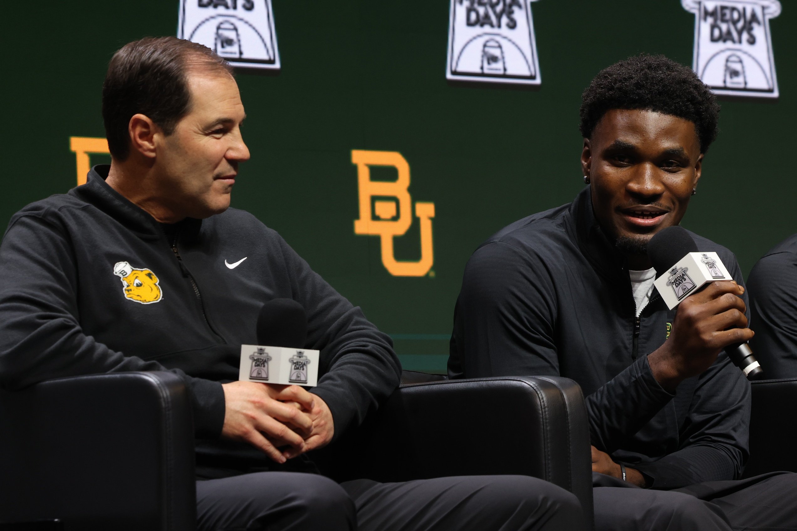 Oct 22, 2025; Kansas City, MO, USA; Baylor’s Tounde Yessoufou (right) speaks to media alongside head coach Scott Drew during Big 12 Men’s Basketball media day at T-Mobile Center. Mandatory Credit: Sophia Scheller-Imagn Images