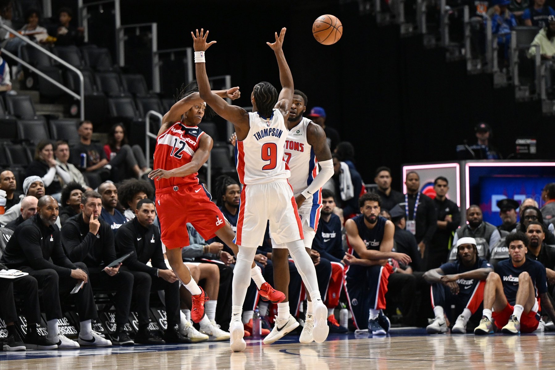 Oct 16, 2025; Detroit, Michigan, USA; Washington Wizards guard Tre Johnson (12) throws a pass over Detroit Pistons guard/forward Ausar Thompson (9) and Pistons forward Paul Reed (7) in the first quarter at Little Caesars Arena. Mandatory Credit: Lon Horwedel-Imagn Images