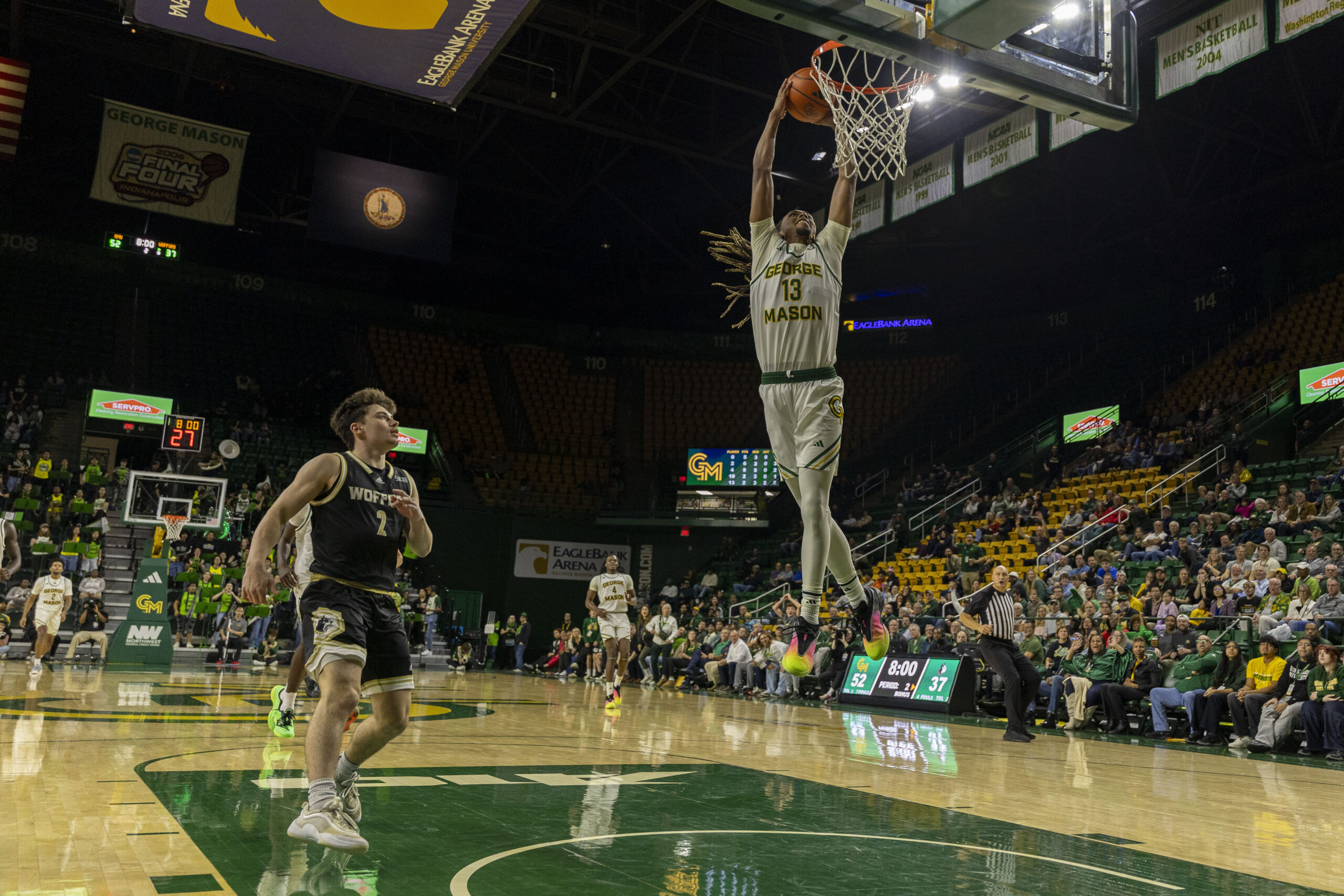 The Patriots would take advantage of the moment, raising their first-ever A-10 regular-season title banner and defeating last season’s Southern Conference tournament champion, Wofford, 70-46.