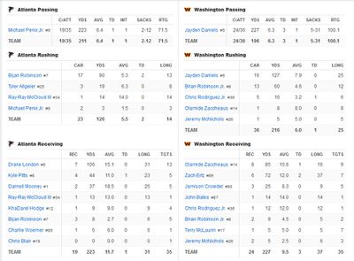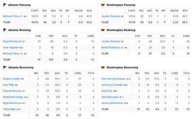 The Commanders were 4.5-point favorites in this game. Everyone knew exactly what to expect from Jayden Daniels, who seemed to have all but guaranteed the Offensive Rookie of the Year award at this point in the season, but the expectations for Michael Penix Jr. in his second NFL start were a bit murkier. With the Buccaneers winning earlier in the afternoon, this will be a critical game for both teams, worthy of prime-time Sunday Night Football.