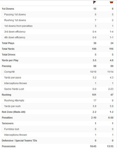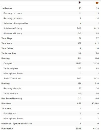 Atlanta ranked 11th on the season in rushing yards allowed at 112 per game, but over their most recent 3-game stretch, which included two victories, they had limited opponents to just 75 rushing yards per game (pretty much what Washington produced in this game).