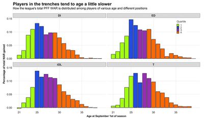 Timo Riske of PFF did a study a few years ago about aging of NFL players at different positions. Not surprisingly, players in the “trenches” achieve a larger fraction of their career wins above replacement (WAR) after age 30 than do “speed” positions such as cornerback and safety: